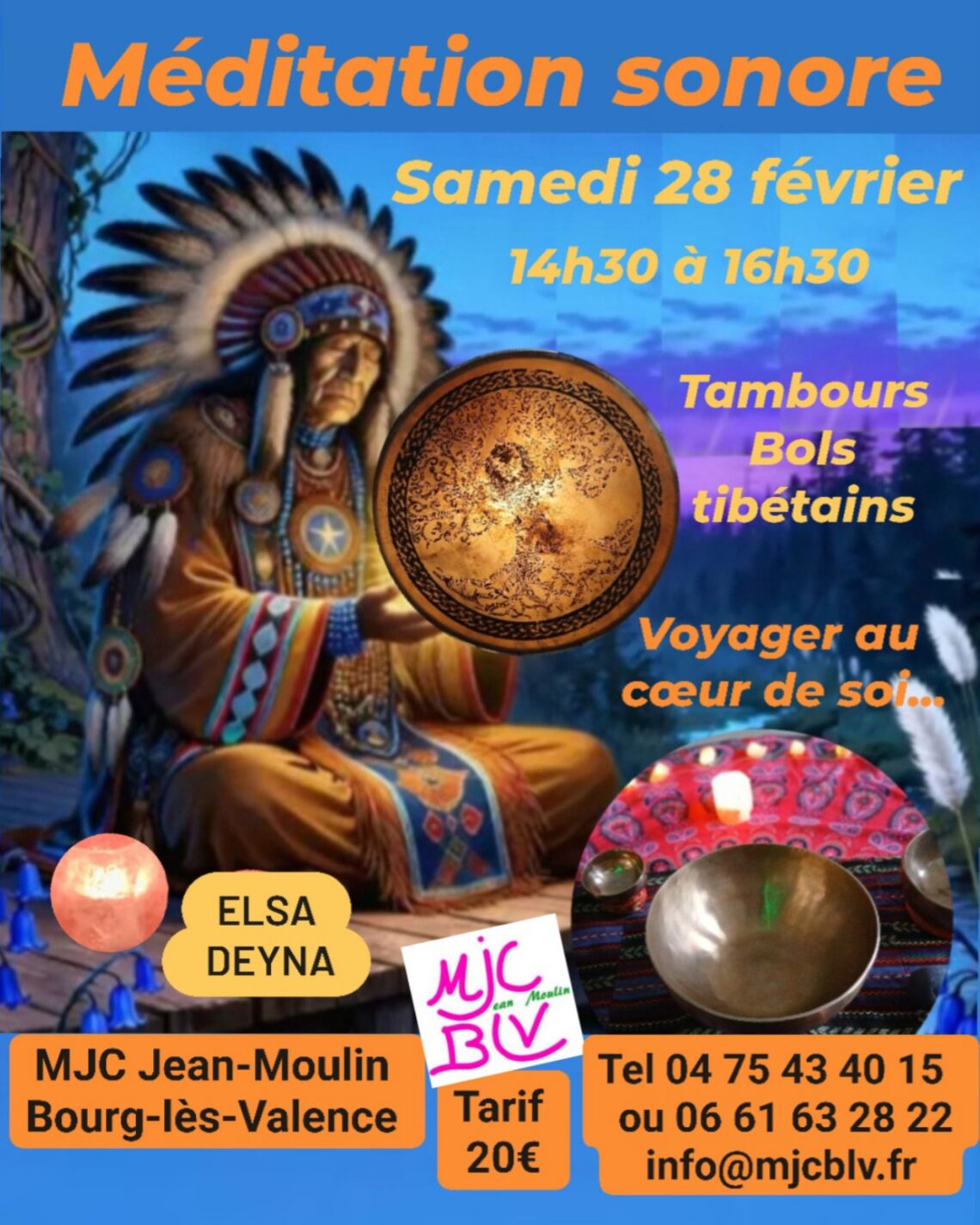 Venez profiter d’une méditation guidée au tambour chamanique pour vous emmener au cœur de vous « m’aime », puis à votre rythme laissez-vous bercer par les harmonies des bols tibétains et autres instruments intuitifs pour une douce et profonde détente. Deux heures de voyage sonore pour un bien-être corps-esprit… Dates des prochains voyages sonores :Samedi 21 mars 16h30-18h30 et samedi 18 avril 18h-20h à la MJC Jean MoulinDimanche 21 juin 18h-20h en extérieur à Crussols (sauf en cas de mauvais temps)
